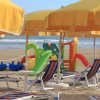 Ombrelloni e lettini gialli su una spiaggia con giochi colorati per bambini in lontananza.